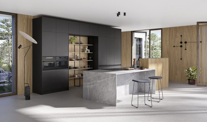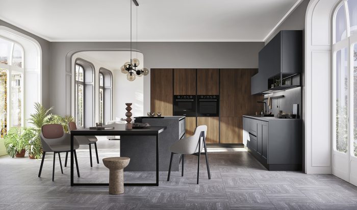 Basi/Pensili Laccato Opaco Asfalt Colonne Cannettato Noce Gola “Elle” Antracite Top Quarzo Resina Sfumato Antracite P34 Piano Tavolo Laccato Opaco Asfalt Elementi a giorno “Tubolari” Laccato Opaco Asfalt