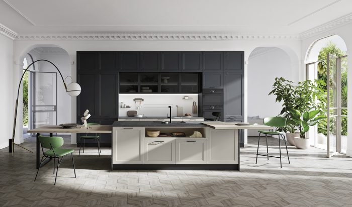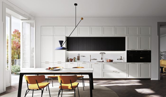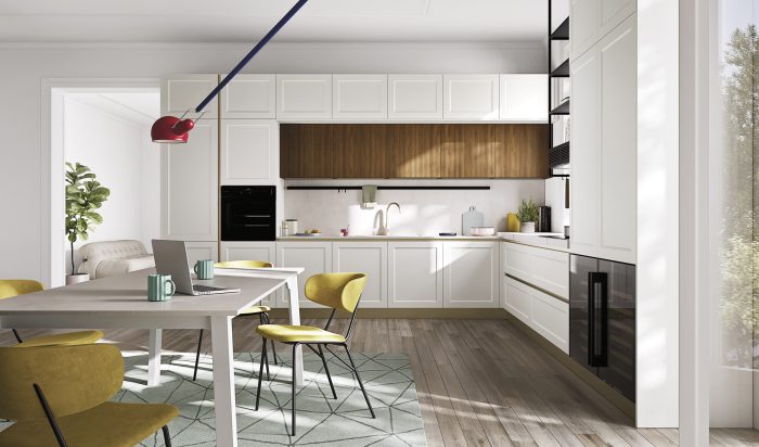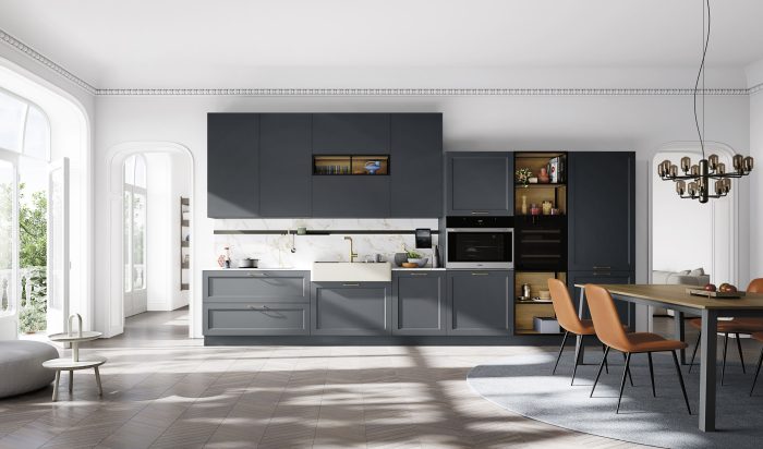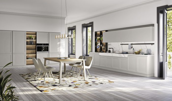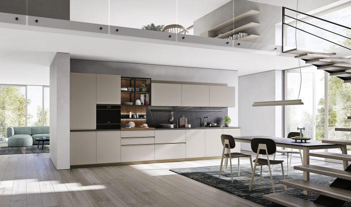 Basi Laccato Opaco Nube, Cannettato Nero Colonne Cannettato Nero Pensili Laccato Opaco Nube Gola “Elle” Antracite Top/Schienale HPL Stratificato Alicante Piano Tavolo Effetto Legno Igloo