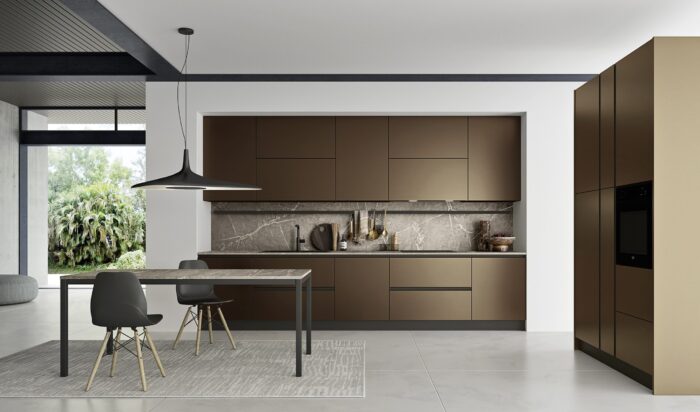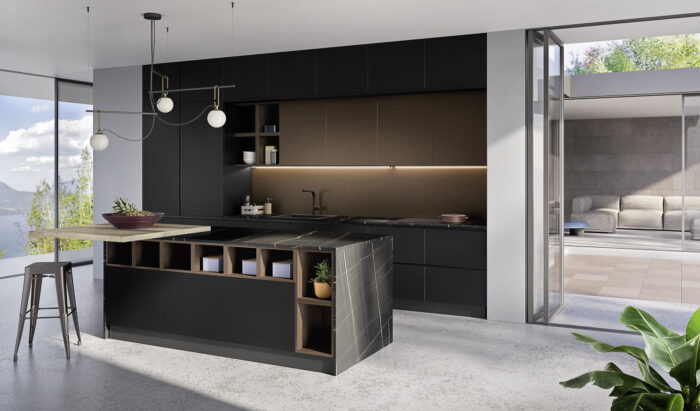 Basi/Colonne PET Nero Pensili PET Acciaio Bronzato Top Laminato HPL Ercole Nero con bordo unicolor Piano snack Laminato HPL Rovere Primitivo Schienale Acciaio Bronzato Pensile “Divido” PET Acciaio Bronzato Elementi a giorno “Living” PET Acciaio Bronzato