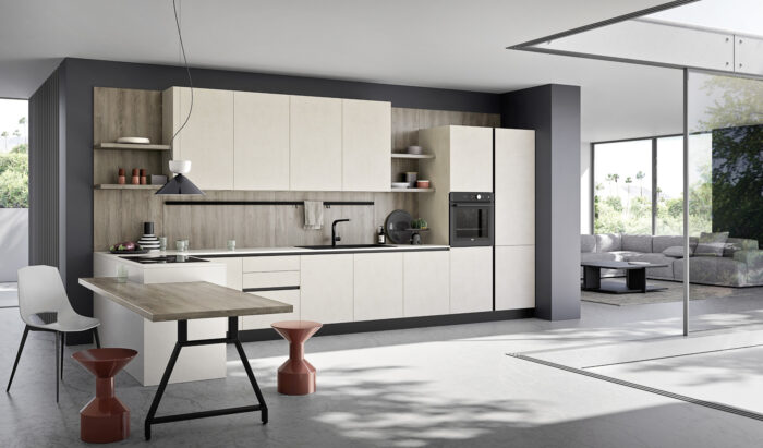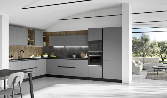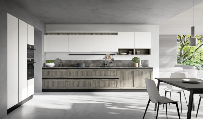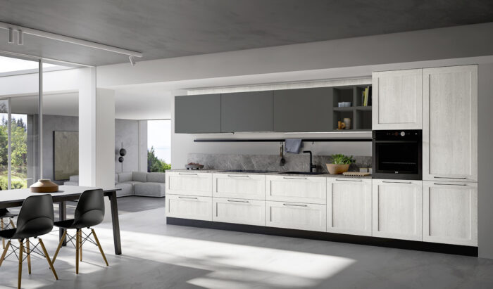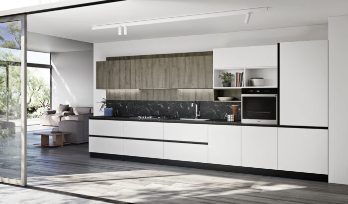 Basi/Colonne PET Bianco Pensili Rovere Nodato Grigio Top Laminato HPL Nero Marquinia con bordo unicolor Pensili a giorno “Living” PET Bianco