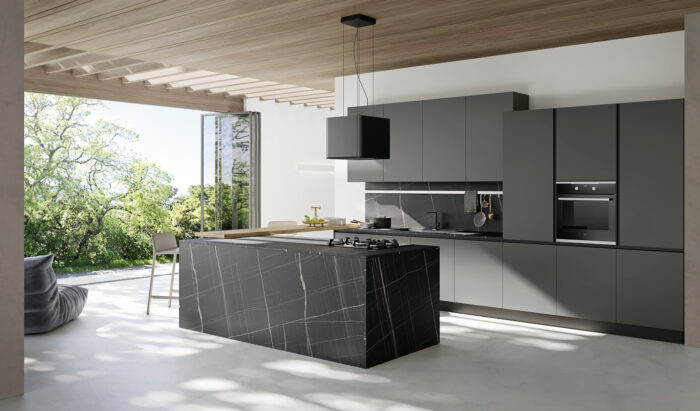 Colonne/Basi/Pensili Grigio Scuro Basi isola Ercole Nero Top Laminato HPL Ercole Nero con bordo unicolor Snack Laminato HPL Rovere Slavonia