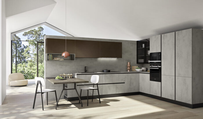 Basi/Colonne Cemento Cenere Pensili PET Acciaio Bronzato Top Laminato HPL Cemento Cenere con bordo unicolor Piano tavolo Laminato HPL Cemento Magma con bordo unicolor Pensili a giorno “Living”/Basi a giorno “Living” Cemento Cenere