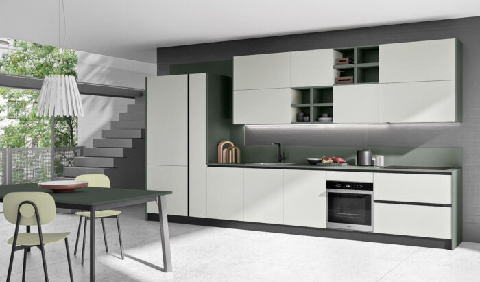 Colonne/Basi/Pensili Grigio Chiaro Top Laminato HPL Verde Irlanda con bordo Unicolor Pensili “Divido” Verde Irlanda
